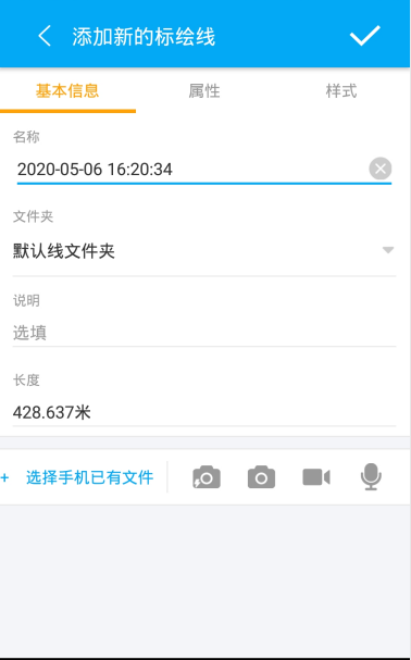 基本信息页面包含:名称、存储文件夹(可参考7.1打点内选择文件夹)、说明、长度(周长,不可更改)、面积(不可更改)、附件选项(可参考7.1打点内附件选项)