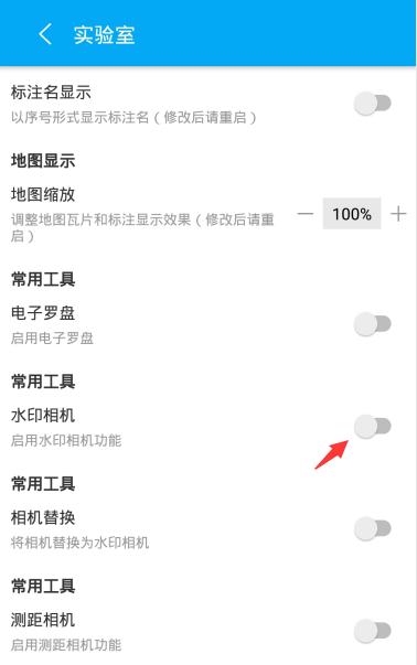 实验室页面中,将水印相机开启,再次回到主界面打开侧边栏时,水印相机会出现在侧边栏中。