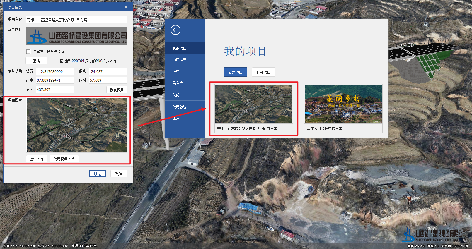 项目图片是指在软件的项目列表中查看的图片。可以点击“上传图片”自定义上传一张图片,也可以调整地图场景视角点击“使用视角图片”将当前场景的图片自动截取为项目图片进行展示。