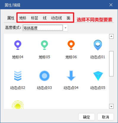 标注标绘图层或KML图层可以存点、标签、线、动态线、面不同类型的要素,可以在图层上分别对每个类型要素统一更换模板。