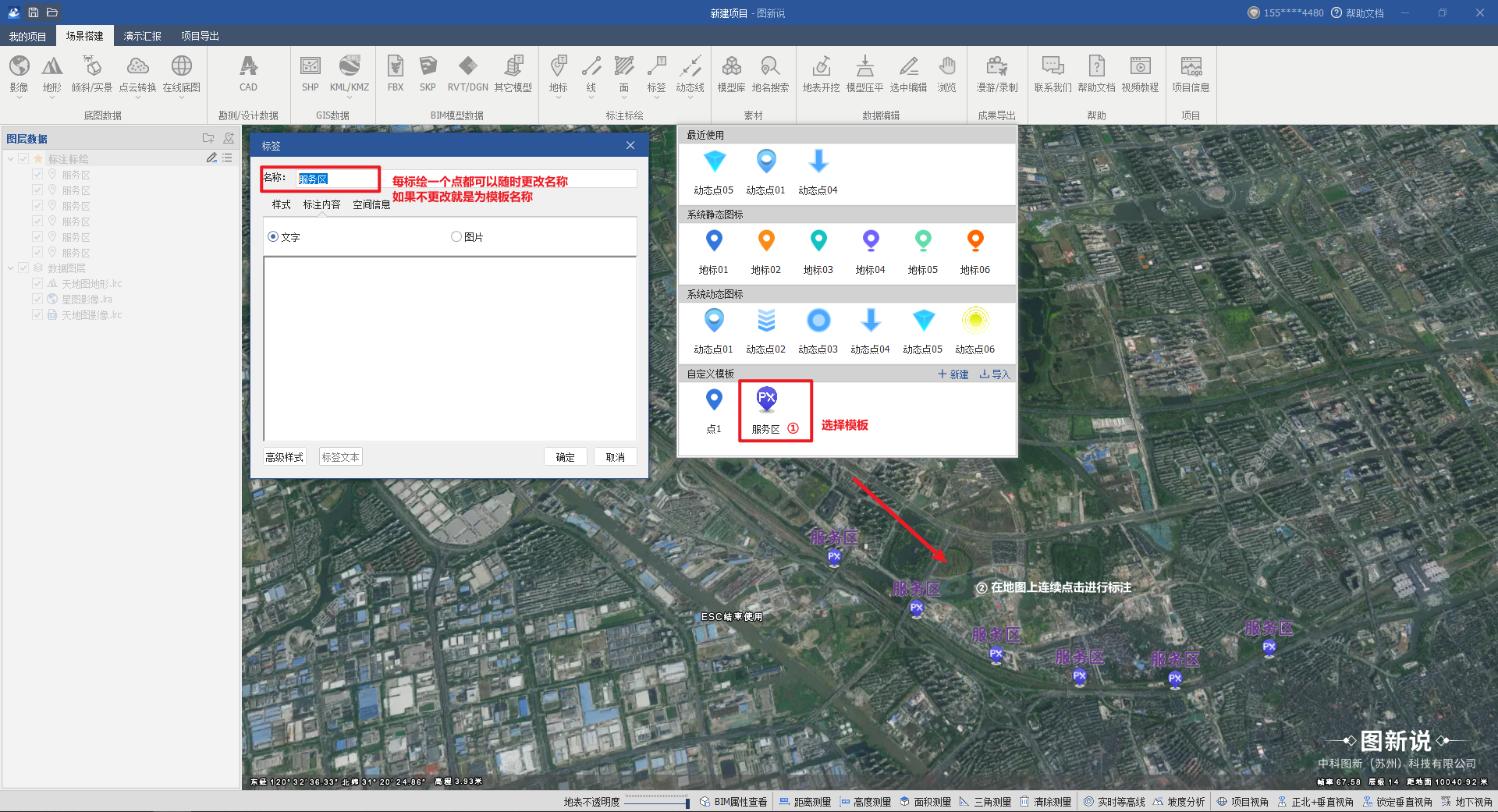 2、系统自带的模板可以点击某一个模板后,在地图上连续单击左键进行标绘,标绘的同时可为每个点更改名称,键盘按ESC结束绘制。