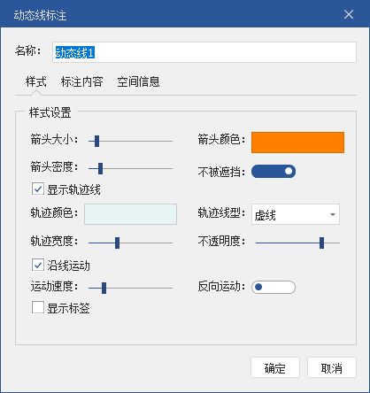 2. 完成后,动态线默认是灰白色线,橘黄色箭头,且不被遮挡。属性内每个参数都可根据实际情况手动进行调整。
