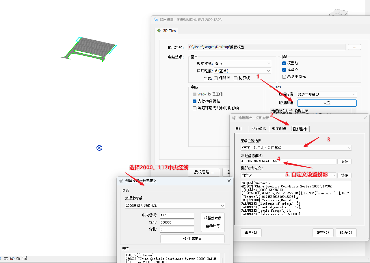 3、点击“图新BIM插件”的导出为3DTiles菜单工具,在弹出的窗口中选择“地理配准”中的设置: